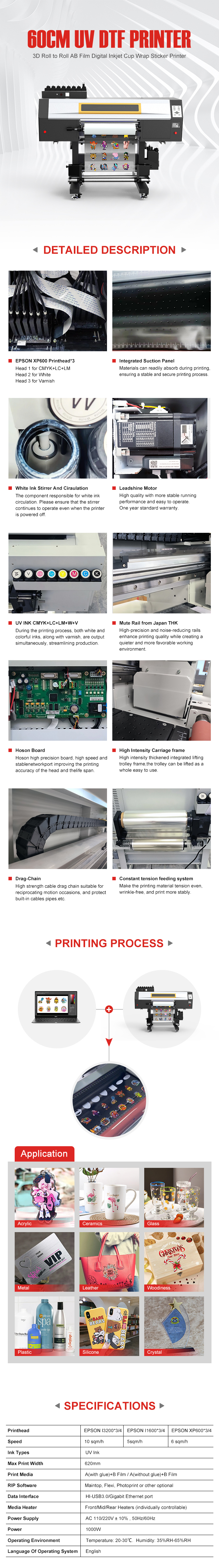 Printhead: EPSON I1600*3 / EPSON I3200*3 / EPSON I1600*4 / EPSON I3200*4 MAX Speed: 7 sqm/h / 10 sqm/h Ink Types: UV Ink Max Print Width: 620 mm