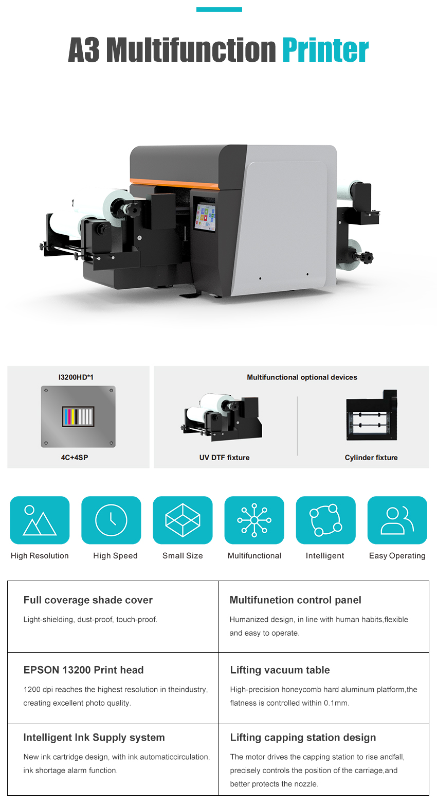 Compact A3 Multifunctional Printer Printhead: Epson I3200(8)-HD Productivity: 4 sqm/h Ink Set: CMYK+W+V/CMYK Lc Lm+W/CMYK Lc Lm Lk Llk/CMYK Print Size: 300*460mm Resolution: 1200dpi