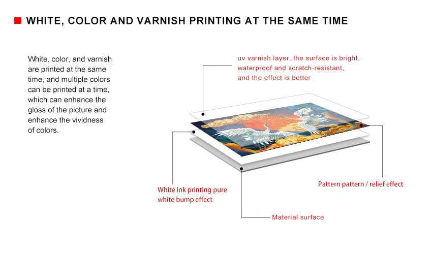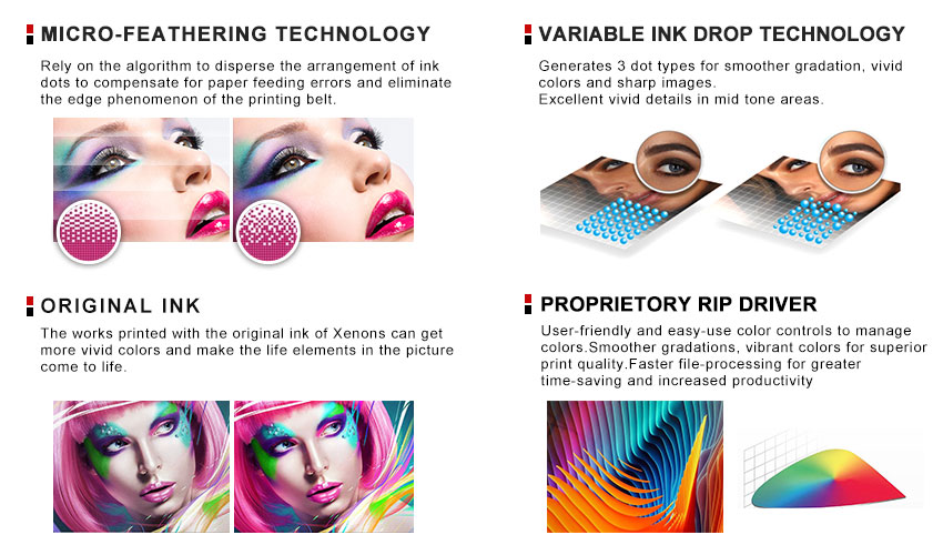 | Variable configuration to satifsy different customers for high speed,high resolution,white application request. True grayscale printing,drop size from 7pl to 21pl,which makes both solid color and color gradation available |