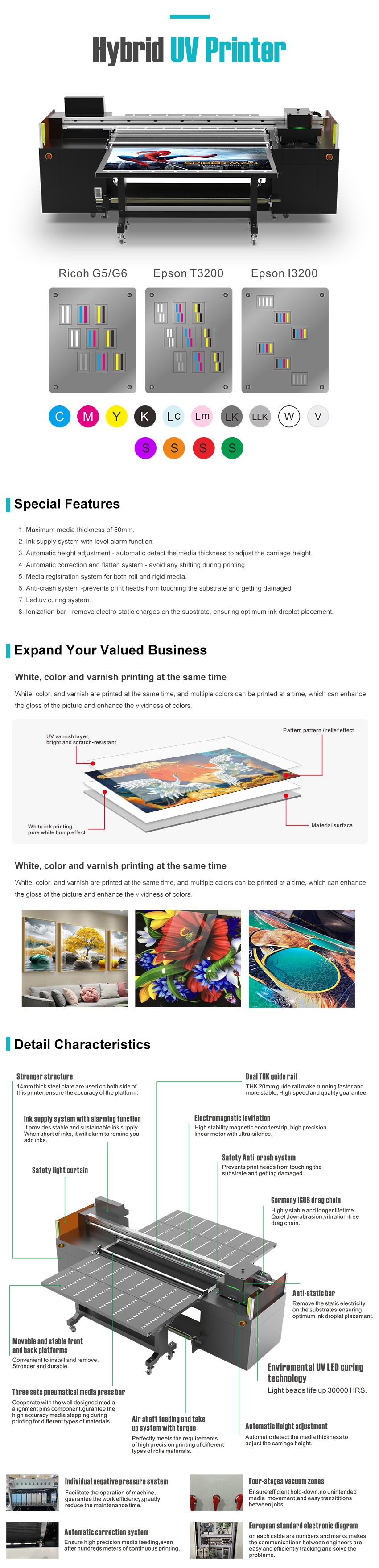 High Quality&Performance Hybrid UV LED Printer Printhead: Ricoh GEN5/GEN6 Productivity: 120 sqm/h Ink Set: CMYK Lc Lm Lk LLk W V/SS Print Size: 1800mm Resolution: 2400dpi